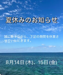 なお、8月14日(木)15(金)はお休みさせていただきます。